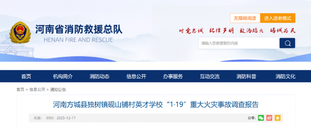 12月17日,河南省发布方城县英才学校重大火灾事故调查报告。经调查认定,该起事故系起火宿舍内一名小学生使用打火机时,引燃宿舍衣服、床铺等物品并迅速蔓延造成的重大火灾,造成13人遇难、4人受伤。