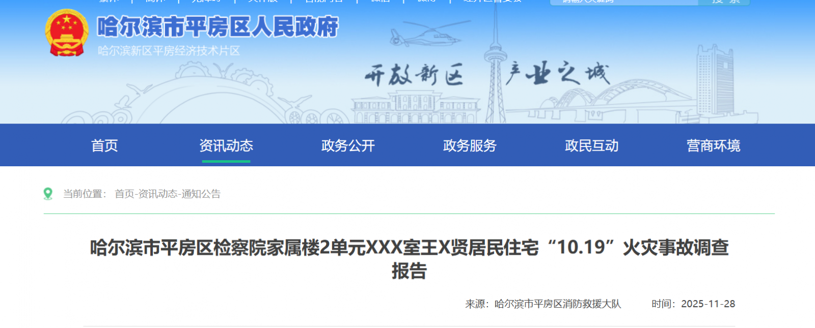 2025年10月19日22时29分,哈尔滨市119指挥中心接到“110”转警称位于哈尔滨市平房区友协大街82号的检察院家属楼2单元XXX室王X贤居民住宅有警情,现场有2人已死亡,由公安机关排除放火及相关刑事案件,将该案件性质定义为亡人火灾后,将现场交由哈尔滨市平房区消防救援大队进行调查,过火面积约3平方米。事故共造成2人死亡(死者王X贤,男,居民身份证号230108XXXXXXXX0618,死者张X芹,女,居民身份证号230108XXXXXXXX0620)。火灾发生后,区委、区政府高度重视,经区消防救援大队呈报区政府同意,专门成立了由区应急管理局、区消防救援大队、平房区公安分局、平新街道办事处、平新派出所等单位组成的检察院家属楼2单元XXX室王X贤、张X芹住宅“10·19”火灾联合调查处理工作组。